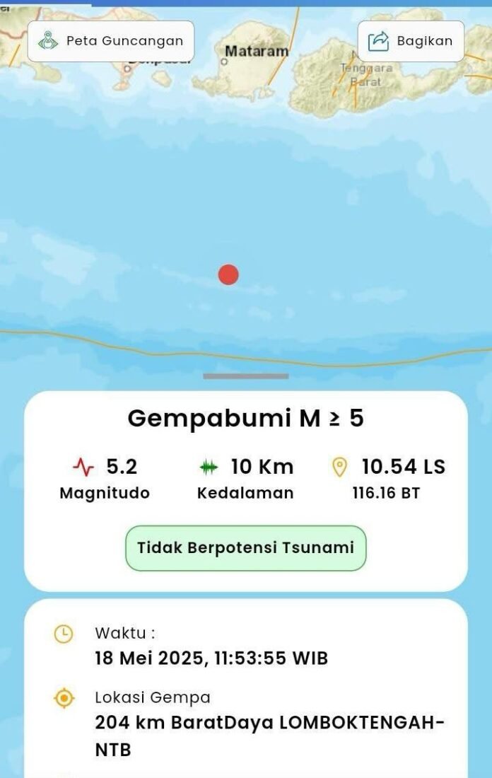 Mataram (Suara NTB) – Gempa bumi berkekuatan Magnitudo 5,2 mengguncang Lombok Tengah (Loteng) pada Minggu, 18 Mei 2025, pukul 11.53 WIB. Gempa tersebut disebabkan akibat adanya aktivitas subduksi lempeng.
