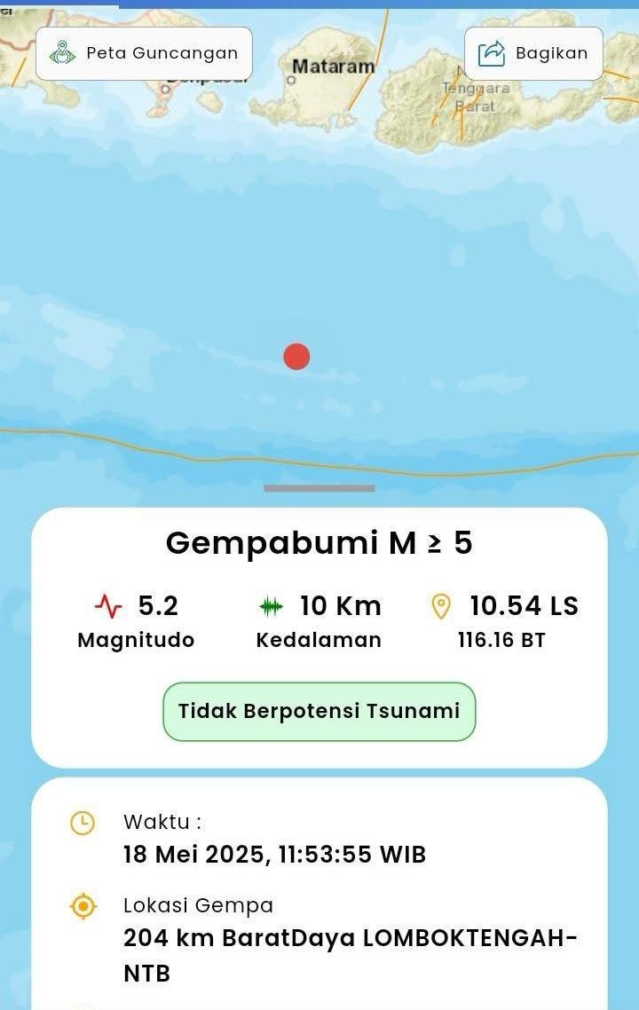 Sumawan mengatakan, gempa tersebut terjadi di laut pada jarak 203 Km arah barat daya Lombok Tengah, NTB dengan koordinat 10,53° LS; 116,12° BT. “Hasil analisis BMKG menunjukkan gempa bumi ini memiliki parameter update dengan magnitudo M 5,0,” ujarnya.
