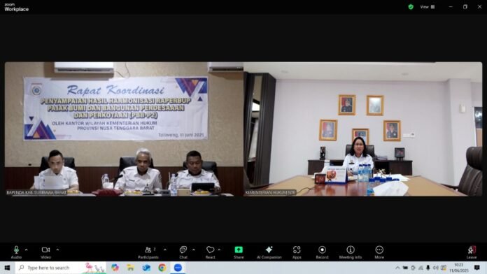 Taliwang (suarantb.com) – Kanwil Kemenkum NTB melalui Perancang Perundang-undangan zonasi Sumbawa Barat dan Pemerintah Daerah Kabupate Sumbawa Barat lakukan Rapat Harmonisasi Rancangan Peraturan Bupati tentang Pajak Bumi dan Bangunan Perdesaan dan Perkotaan pada Rabu, 11 Juni 2025 di Ruang Rapat Kenawa Setda Kabupaten Sumbawa Barat.