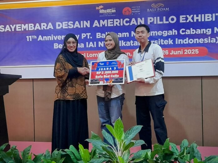 Mataram (Suara NTB) – Dua mahasiswa Program Studi Arsitektur Universitas Mataram (Unram), Dani dan Antia, menorehkan prestasi membanggakan. Keduanya sukses masuk tiga besar dalam Sayembara Desain Booth American Pillo yang diselenggarakan PT Balifoam Nusamegah untuk mendesain booth pameran produk-produk mereka.