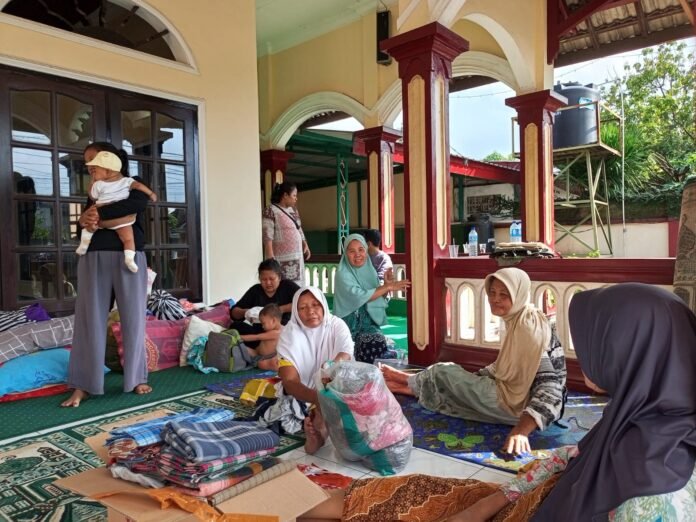 Yeni, seorang warga lain yang juga mengungsi di musala terlihat sibuk pulang pergi memantau kondisi rumahnya. Di sisi lain, ia harus mengurus anaknya yang masih balita.