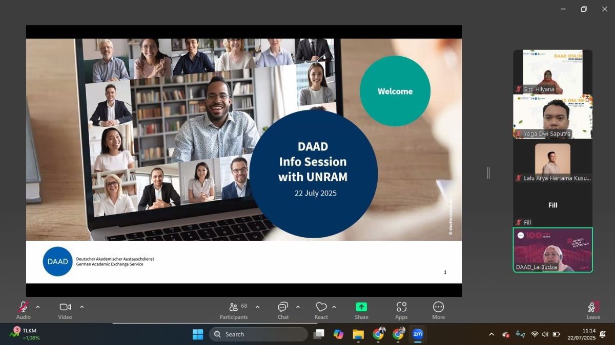 Mataram (Suara NTB) – Universitas Mataram (Unram) melalui Unit Penunjang Akademik Bimbingan Konseling dan Pembinaan Karir (UPA BKPK) bekerja sama dengan Kantor Urusan Internasional (KUI) menyelenggarakan DAAD Online Info Session secara daring melalui Zoom Meeting, pada Selasa, 22 Juli 2025. Kegiatan ini merupakan bentuk fasilitasi informasi beasiswa luar negeri, khususnya beasiswa di Jerman bagi dosen, mahasiswa, dan alumni Unram.