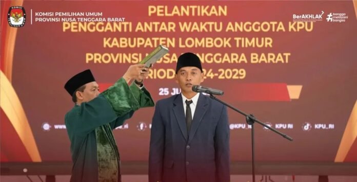 Mataram (Suara NTB) – Komisi Pemilihan Umum (KPU) Republik Indonesia melantik Muhammad Suja’i sebagai Pengganti Antar Waktu (PAW) anggota KPU Kabupaten Lombok Timur. Pelantikan dilakukan secara daring oleh Ketua KPU RI, Mochammad Afifuddin, didampingi anggota KPU Parsadaan Harahap dan Iffa Rosita, Jumat pekan lalu.