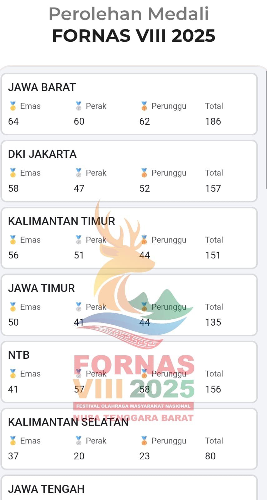 Mataram (Suara NTB) – Kontingen Nusa Tenggara Barat (NTB) berhasil menembus lima besar klasemen sementara Festival Olahraga Rekreasi Nasional (Fornas) VIII Tahun 2025. Lonjakan peringkat ini dipicu oleh tambahan 23 medali emas yang diraih para pegiat dari sejumlah Induk Organisasi Olahraga (Inorga).