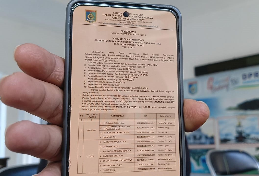 Hasil seleksi administratif ini pun telah diumumkan oleh Tim Pansel melalui website resmi Pemkab dan BKD dan BPSDM Lobar. Tahapan selanjutnya, dilaksanakan technical meeting yang digelar, Rabu, 6 Agustus 2025.