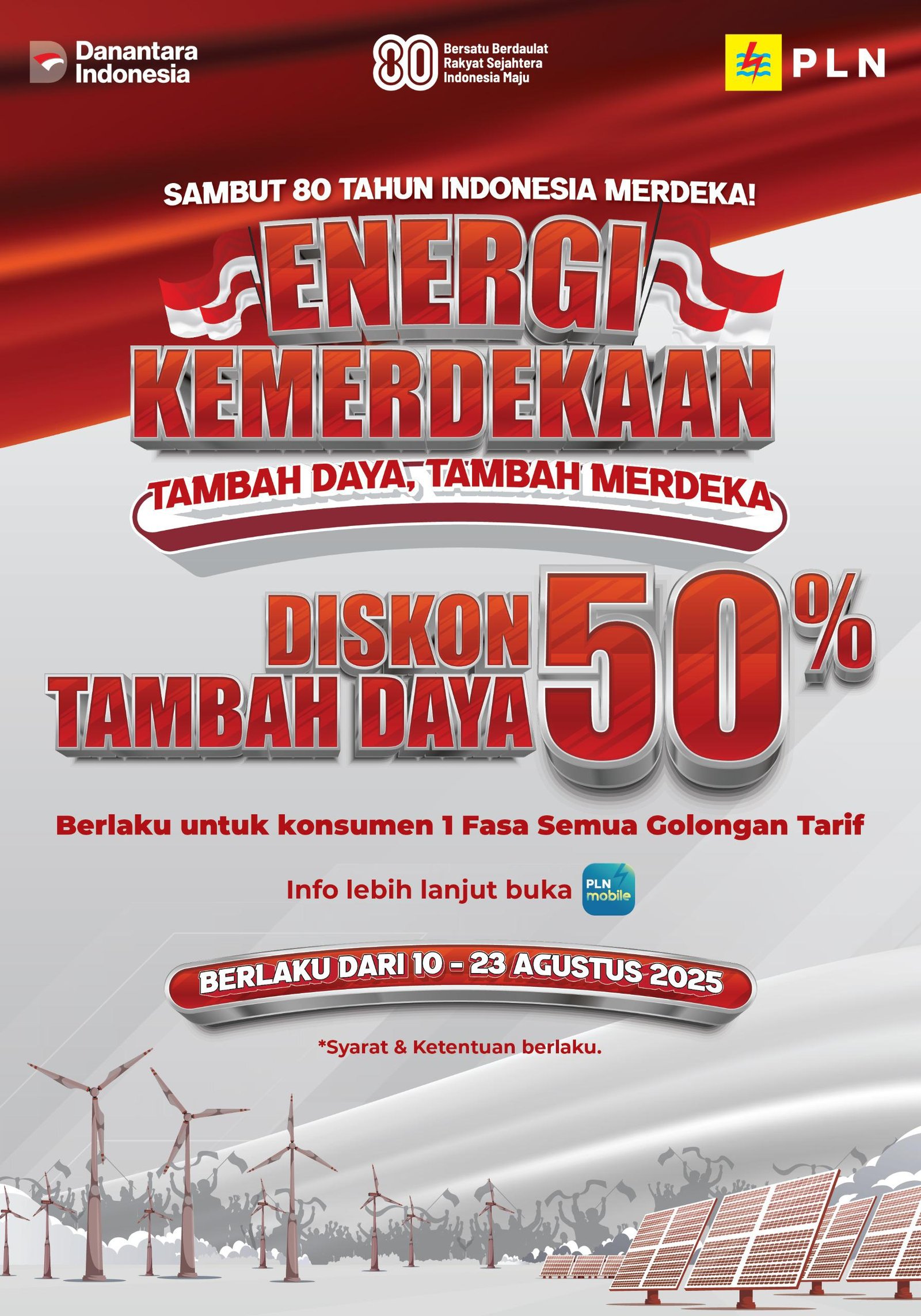 Jakarta (Suara NTB) – Dalam rangka menyemarakkan Hari Ulang Tahun ke-80 Kemerdekaan Republik Indonesia, PT PLN (Persero) menghadirkan program spesial bertajuk “Energi Kemerdekaan”. Melalui program ini, pelanggan dapat menikmati diskon tambah daya listrik 50 persen yang berlangsung mulai 10 hingga 23 Agustus 2025.