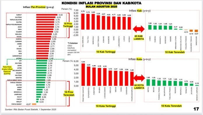 Mataram (Suara NTB) – Badan Pusat Statistik (BPS) mencatat tingkat inflasi Provinsi Nusa Tenggara Barat (NTB) secara year-on-year (y-on-y) pada Agustus 2025 sebesar 2,56 persen, dengan Indeks Harga Konsumen (IHK) mencapai 108,48. Meski masih dalam rentang target nasional, NTB masuk dalam kategori merah dalam peta inflasi antarprovinsi versi Kementerian Dalam Negeri.