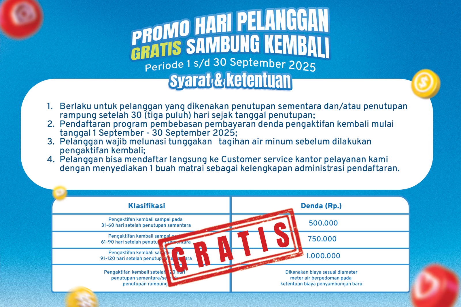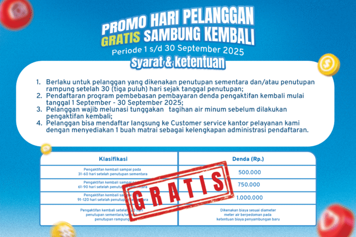 Promo yang berlaku mulai 1 hingga 30 September 2025 ini bertujuan untuk memberikan kemudahan serta meringankan beban pelanggan yang sebelumnya mengalami pemutusan aliran air. Pelanggan yang ingin memanfaatkan promo ini dapat mendaftar di Customer Service kantor pelayanan terdekat dengan membawa satu lembar materai sebagai syarat administrasi.