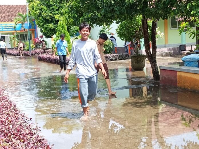 Dari pantauan, air sungai menggenang di sejumlah jalan yang sering siswa dan guru lalui. Genangan tersebut kemudian memaksa pelajar dan pengajar mencopot sepatunya untuk sekadar lewat.
