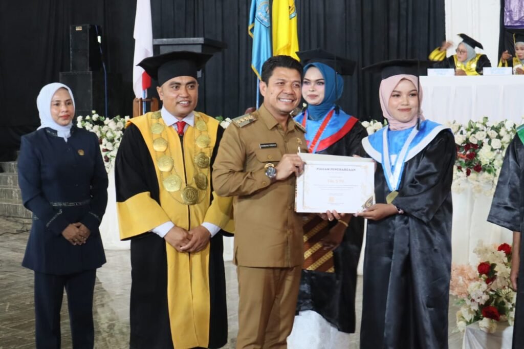Bupati Dompu, Bambang Firdaus menyerahkan piagam penghargaan wisudawan terbaik. (suarantb.com/ula)