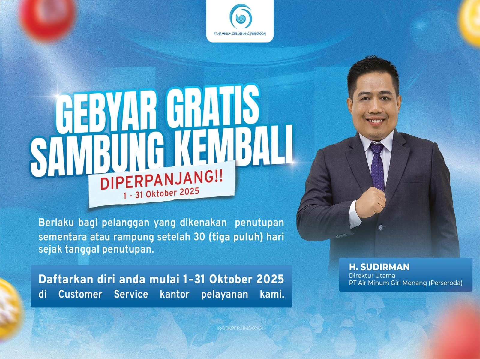 Mataram (Suara NTB) – PT Air Minum Giri Menang (Perseroda) kembali melanjutkan Program Gratis Denda Sambung Kembali kepada pelanggan yang dikenakan penutupan sementara dan/atau penutupan rampung. Program ini memberikan layanan bebas denda pengaktifan sambung kembali bagi pelanggan yang ingin kembali menikmati pelayanan air bersih.