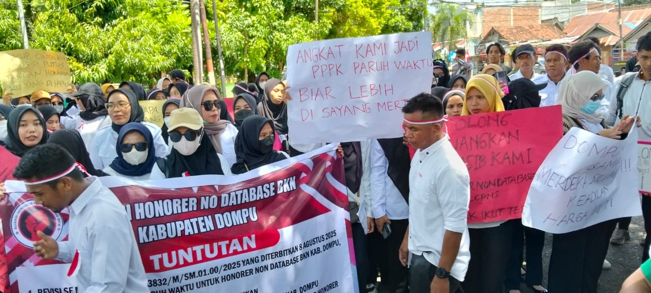 Dompu (suarantb.com) – Aliansi Honorer Non-Database Kabupaten Dompu menuntut Bupati Dompu untuk memperjuangkan nasib mereka ke Kementerian PAN RB RI dengan alokasi tambahan PPPK Paruh Waktu. Para honorer ini menolak kebijakan dirumahkan setelah cukup lama mengabdi bagi daerah.