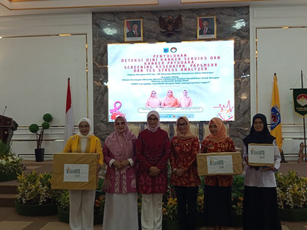 Mataram (suarantb.com) – Menjelang Hari Ulang Tahun Dharma Wanita Persatuan (DWP) ke-26, DWP Kota Mataram menyelenggarakan penyuluhan dan pemeriksaan kesehatan berupa skrining kesehatan dasar Cek Kesehatan Gratis (CKG), deteksi dini kanker serviks, kanker payudara, skrining papsmear, serta tes stress analyzer. Kegiatan tersebut berlangsung di Pendopo Wali Kota Mataram, Rabu (19/11/2025).