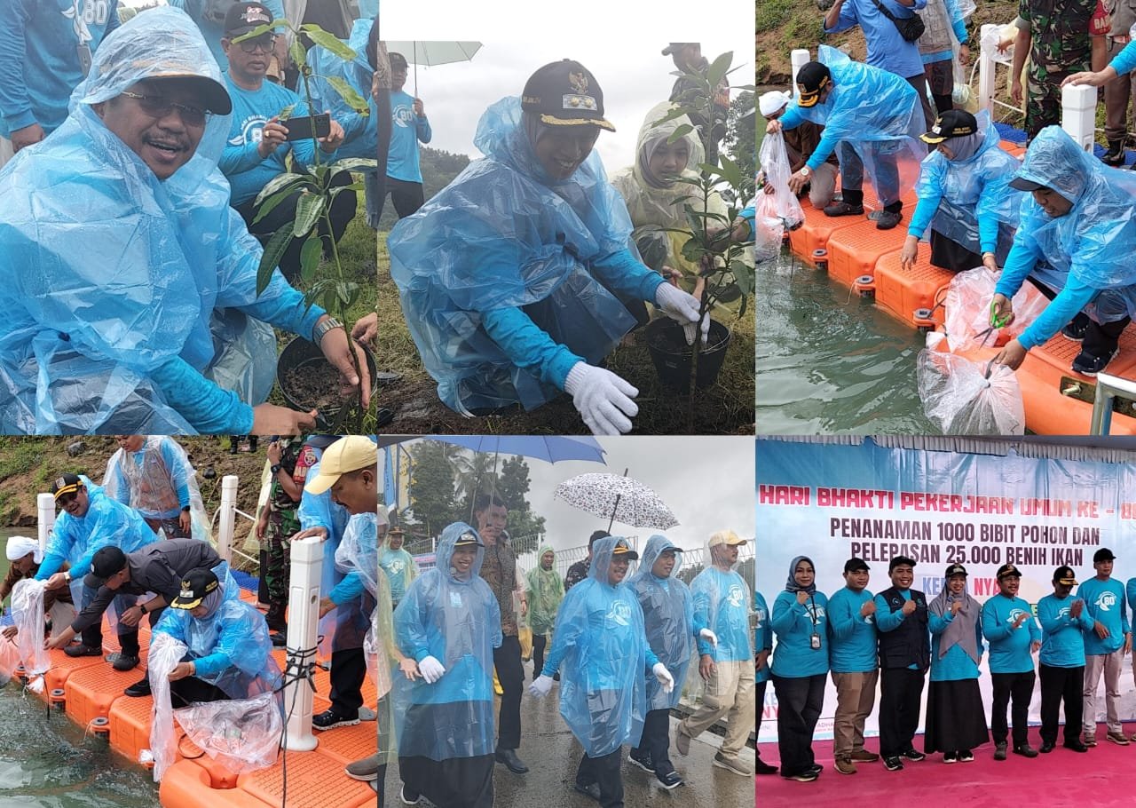 Giri Menang (Suara NTB) – Aksi nyata dilakukan Bupati Lombok Barat (Lobar), H. Lalu Ahmad Zaini dan Wakil Bupati Hj. Nurul Adha bersama jajaran pada peringatan Hari Bhakti Pekerjaan Umum (PU) ke-80 yang digelar Dinas Pekerjaan Umum dan Tata Ruang (PUTR). Bupati dan Wabup kompak turun menanam benih pohon dan melepas benih ikan di Bendungan Meninting, pada Kamis (27/11/2025).
