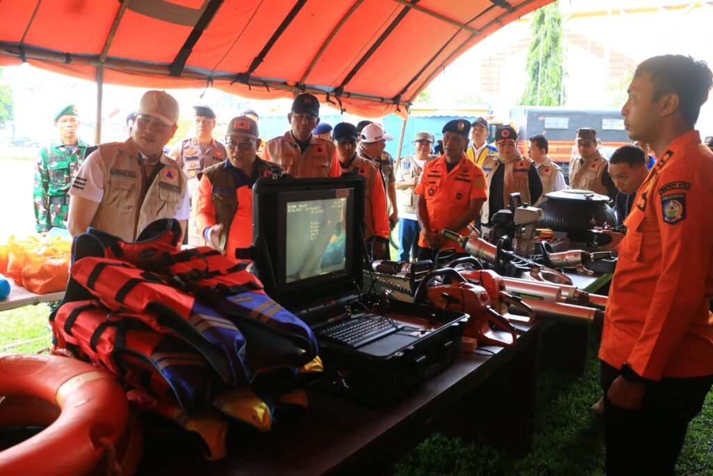 Didampingi Wakil Gubernur, Ketua DPRD dan Forkopimda, Gubernur meninjau sarana dan prasarana serta pasukan yang akan dilibatkan dalam penanganan bencana.