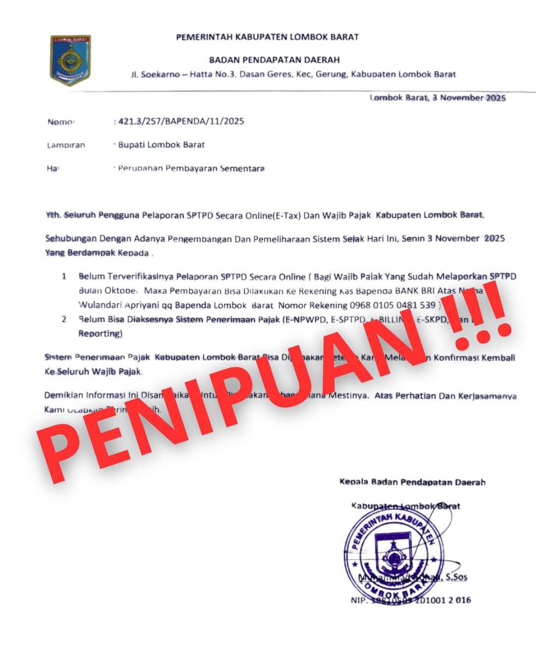 Giri Menang (Suara NTB) – Dugaan penipuan mencatut nama Organisasi Perangkat Daerah (OPD) Badan Pendapatan Daerah (Bapenda) Lombok Barat mencuat. Modus pelaku penipuan mengirim surat pemberitahuan kepada wajib pajak (WP) seolah terjadi perubahan pembayaran sementara. Pelaku meminta pembayaran pajak disetor ke rekening mengatasnamakan Bapenda. Tanda tangan dan stempel OPD dalam surat tersebut diduga dipalsukan.
