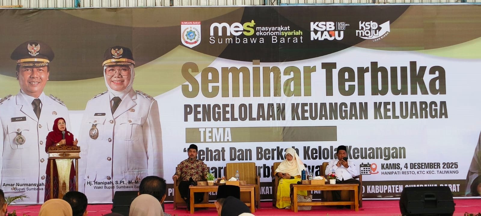 Taliwang (Suara NTB) – Wakil Bupati (Wabup) Sumbawa Barat, Hj. Hanipah Musyafirin, SPt., MM Inov membuka secara resmi kegiatan seminar Pengelolaan Keuangan Keluarga yang diselenggarakan oleh Pengurus Daerah Masyarakat Ekonomi Syariah (PD MES) Kabupaten Sumbawa Barat (KSB), Kamis, 4 Desember 2025.