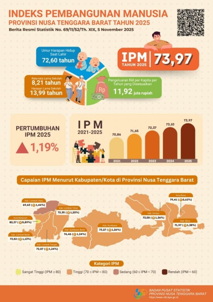 Berdasarkan data capaian IPM menurut kabupaten/kota di NTB yang bersumber dari BPS tahun 2025, secara umum IPM NTB dan kabupaten/kota mengalami kenaikan. Terdapat kenaikan 0,087 poin untuk IPM NTB tahun 2025 ini, dibanding tahun 2025.