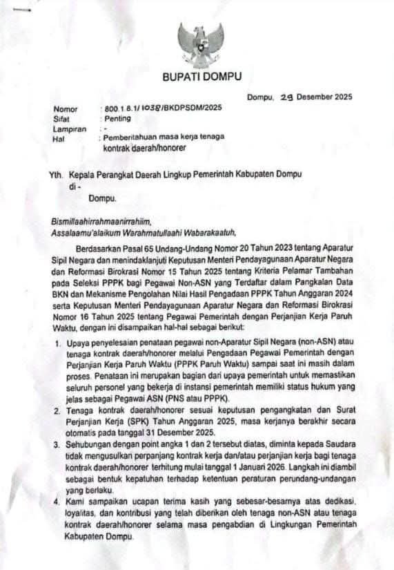 Permintaan ini tertuang dalam surat Bupati Dompu dengan Nomor : 800.1.8.1/1038/BKDPSDM/2025 tanggal 29 Desember 2025. Surat yang ditujukan kepada Kepala Perangkat Daerah Lingkup Pemerintah Kabupaten Dompu ini, bersifat penting sebagai pemberitahuan masa kerja tenaga kontrak daerah / honorer.