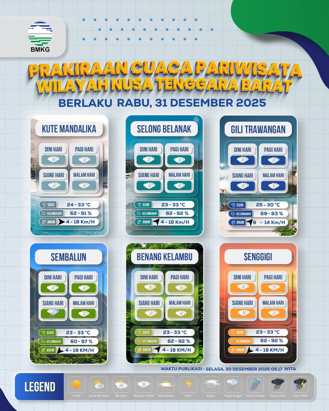 Berdasarkan rilis resmi Stasiun Meteorologi Zainuddin Abdul Madjid Lombok, Selasa, (30/12/2025) cuaca di Pulau Lombok dan Pulau Sumbawa umumnya berawan sejak dini hari hingga malam hari. Beberapa wilayah diprakirakan berpotensi mengalami hujan ringan pada siang hingga sore hari.