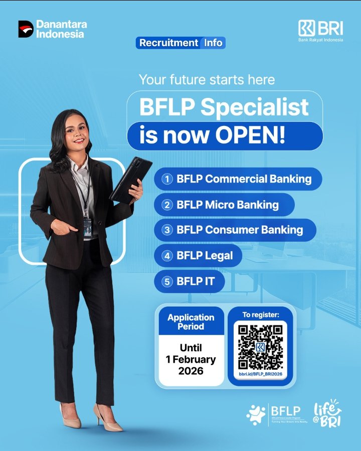 Adapun persyaratan khusus untuk masing-masing jalur spesialisasi, termasuk ketentuan latar belakang pendidikan, kompetensi teknis, serta kualifikasi pendukung lainnya, dapat dilihat secara lengkap melalui laman resmi rekrutmen BRI di bbri.id/BFLP_BRI2026.