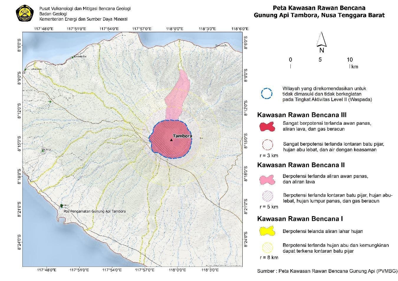 Dengan status ini, masyarakat dan pengunjung diminta untuk tidak memasuki atau melakukan aktivitas di dalam radius 3 kilometer dari pusat aktivitas Gunung Tambora. “Radius 3 kilometer ini berada di kawah Gunung Tambora. Peningkatan aktivitas vulkanik ini terjadi pada Doro Afi Toi dan Doro Afi Bou yang berada dalam kaldera Tambora,” ungkap Pengamat Pos Pengamatan Gunungapi Tambora di Desa Doro Peti, Kecamatan Pekat, Kabupaten Dompu, Rasyidin saat dihubungi, Rabu (11/3/2026) pagi.