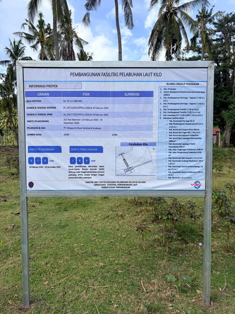 Dikatakan Prayitno, semua persiapan untuk pembangunan Pelabuhan Laut Kilo sudah siap. Kontraktor pelaksana juga sudah menyiapkan kebutuhan untuk rencana pembangunan, termasuk gudang dan kebutuhan lainnya. “Waktu pelaksanaan 315 hari hingga 30 Desember 2026 dengan masa pemeliharaan 180 hari,” jelasnya.