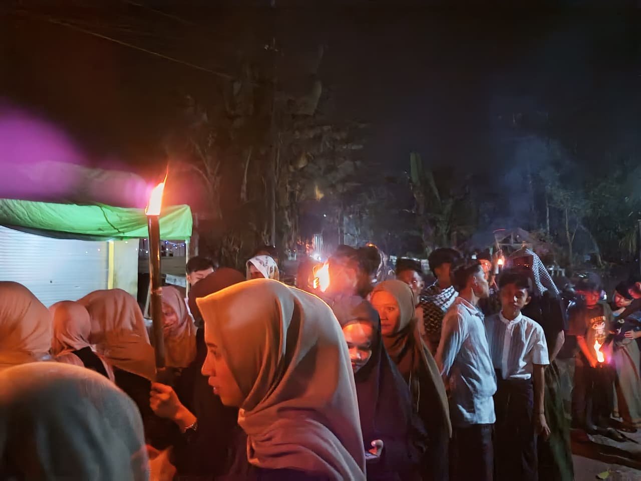 Warga desa berjalan dengan membawa obor di tangan sembari menyerukan takbir tanda kemenangan.