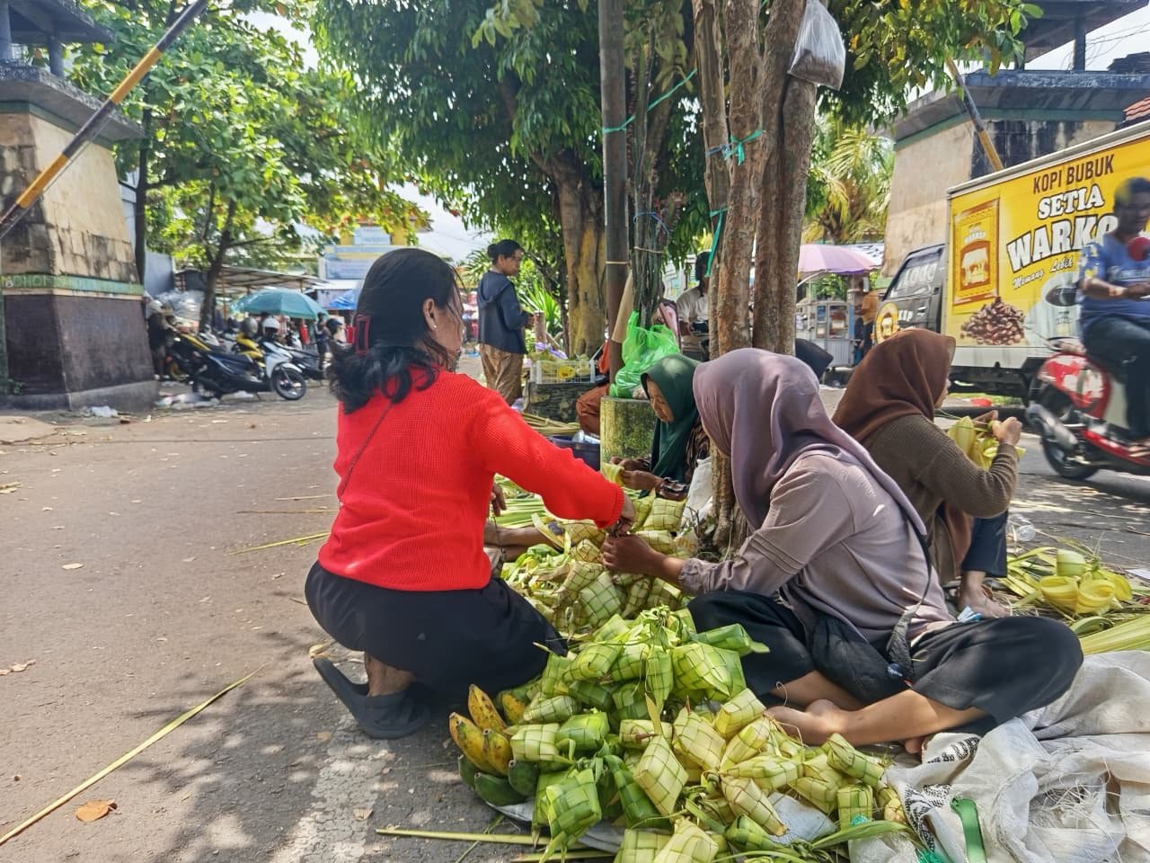 Sejak dini hari, Nurul sudah menempuh perjalanan dari desanya menuju pasar. Ia membawa puluhan ikatan janur yang telah dipersiapkan sehari sebelumnya. Ada janur yang sudah dirajut menjadi ketupat, ada pula yang masih utuh. Bahkan, ia juga menawarkan kemasan ketan berbentuk bantal, menambah variasi dagangannya.