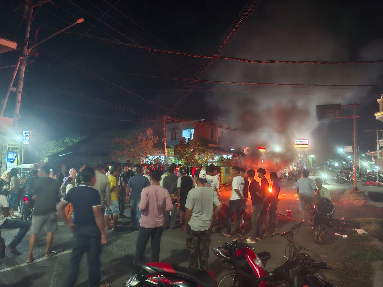 Massa membakar ban bekas di jalan depan Masjid Qusurul Jannah, Kelurahan Kandai Dua dan menutup jalan dengan sepeda motor, agar tidak bisa dilewati kendaraan. Mobil truk yang mengangkut gabah dan hendak melintas, juga nyaris jadi sasaran amukan warga.