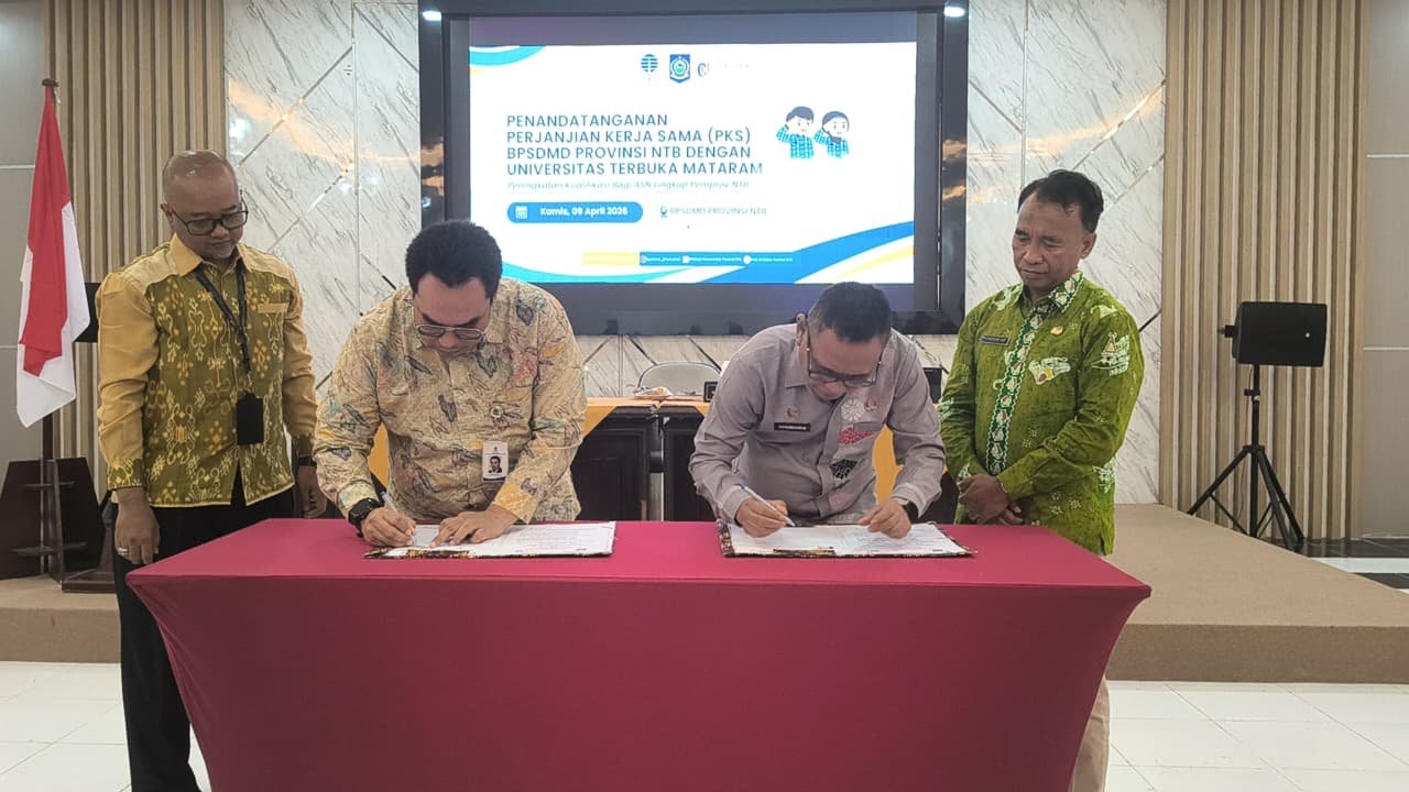 Mataram (suarantb.com) – Dalam upaya meningkatkan kualitas dan kualifikasi Aparatur Sipil Negara (ASN), Badan Pengembangan Sumber Daya Manusia Daerah (BPSDMD) Provinsi Nusa Tenggara Barat (NTB) resmi menandatangani Perjanjian Kerja Sama (PKS) dengan Universitas Terbuka Mataram, Kamis, 9 April 2026. Penandatanganan ini dilakukan Kepala BPSDMD Provinsi NTB Drs. H. Fathurrahman, MSi., dan Direktur Universitas Terbuka Mataram Ronny Basista, PhD.,