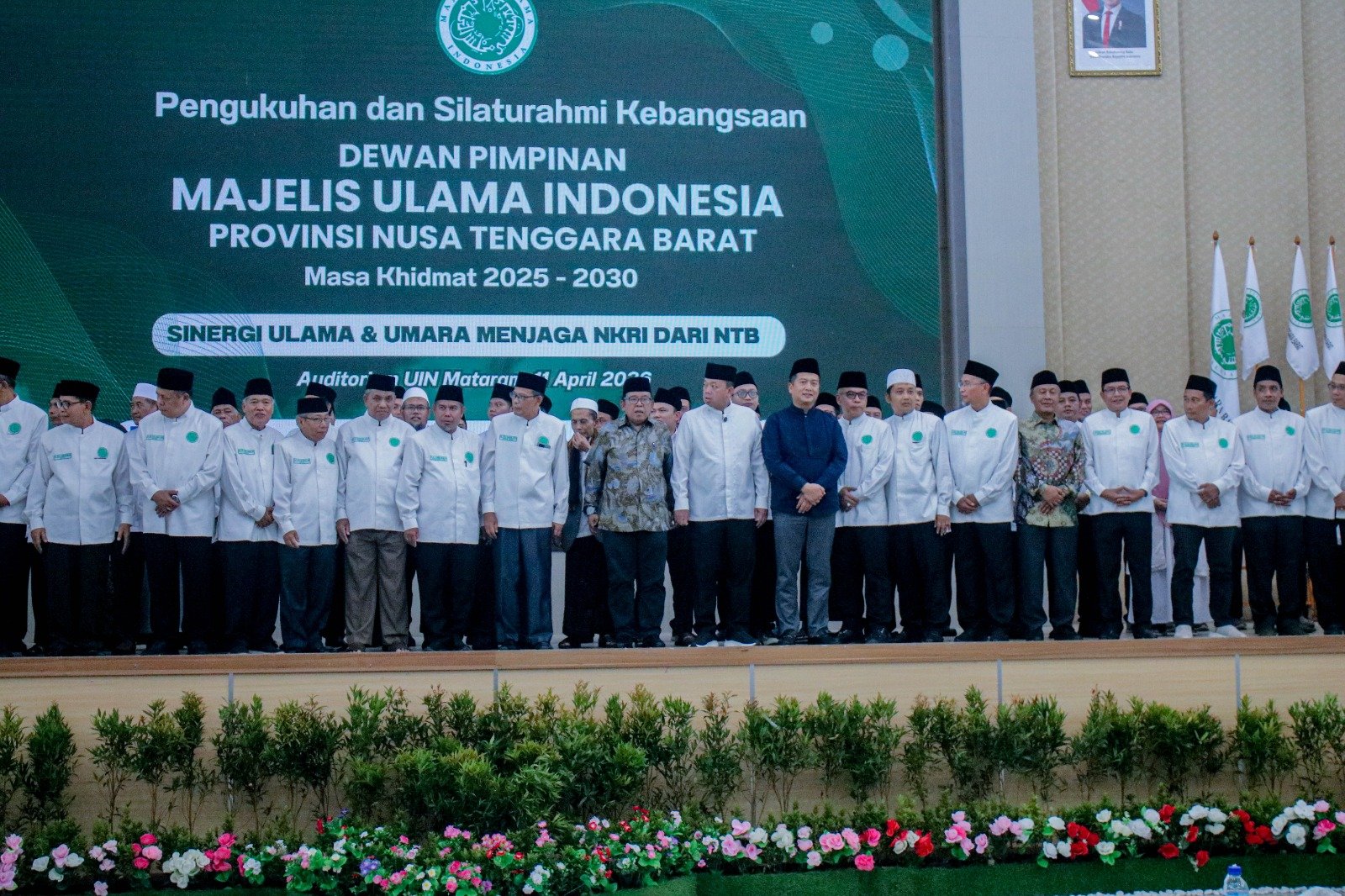 Mataram (Suara NTB) –Pengurus Dewan Pimpinan Majelis Ulama Indonesia (MUI) Provinsi Nusa Tenggara Barat (NTB) masa khidmat 2025–2030 resmi dikukuhkan dalam rangkaian kegiatan silaturahmi kebangsaan di Auditorium UIN Mataram, Sabtu (11/4/2026). Acara ini mengusung tema “Sinergi Ulama dan Umara Menjaga NKRI dari NTB”.